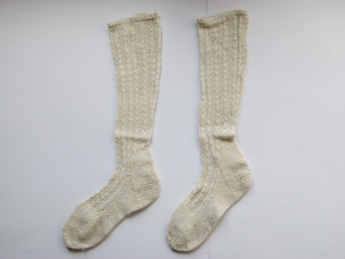 Calzini in lana bianca lavorata a ferri: il gambale è lavorato a treccine, il piede è lavorato a maglia rasata.Notizie storico-critiche