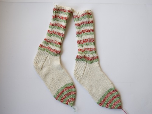 Calzini nuovi in lana bianca lavorata a ferri: il gambale è lavorato a coste a righe sottili alternate di lana verde e rossa e bianca; piede è lavorato a maglia rasata con lana bianca; la punta è a righe verdi bianche e rosse.Notizie storico-critiche