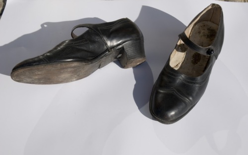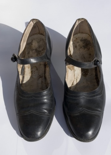 Scarpe da balia con tomaia in cuoio nero traforato sul collo del piede a formare un motivo decorativo, sulla punta altro motivo decorativo creato da una doppia cucitura a "V". Le scarpe sono chiuse da un cinturino in pelle fermato da un bottone rotondo in plastica nera lucida. La suola e il tacco sono in cuoio e sono fissati alla tomaia grazie a piccoli chiodi in metallo.Notizie storico-critiche