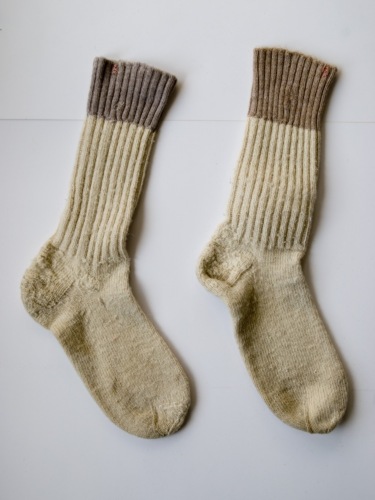 Calzini in lana lavorata a ferri: il gambale è lavorato a coste, nella parte alta è in lana marrone, nella parte inferiore in lana bianca; il piede è lavorato a maglia rasata in lana bianca.Notizie storico-critiche