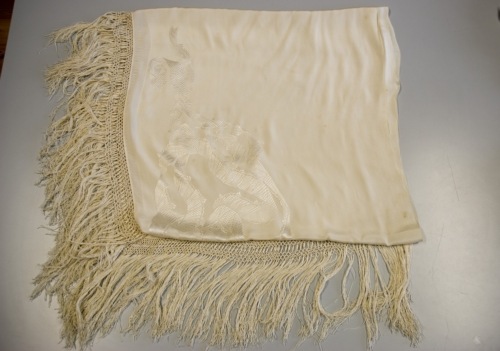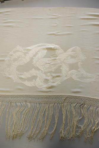 Sciarpa in seta color avorio con frange applicate con cinque legature. Presenta al centro un ricamo rappresentante un motivo a nastri fatto a mano in filo di seta color avorio.Notizie storico-critiche