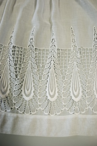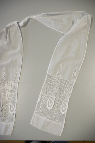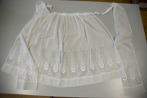 Grembiule in organza di cotone bianco. In vita sotto il cinturone c'è un'arriciatura. Il fondo del grembiule è caratterizzato da un alto ricamo (30 cm) realizzato a punto pieno e a punto a giorno a formare una decorazione fitomorfa. Sul fondo dei legacci compare lo stesso ricamo.Notizie storico-critiche