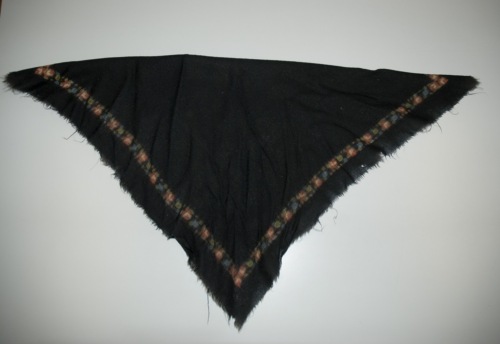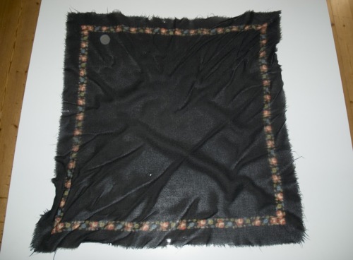 Fazzoletto da testa in lana nera, decorato lungo il bordo da una stampa di roselline rosse e blu. Il bordo ha una piccola sfrangiatura.Notizie storico-critiche