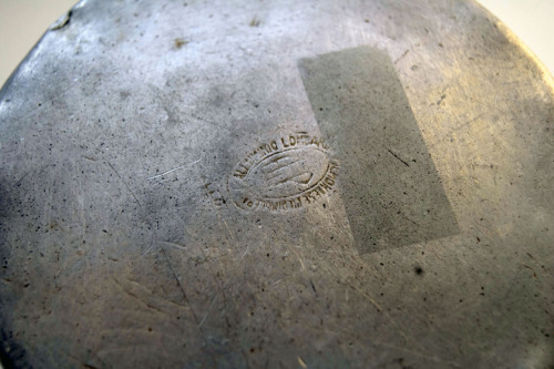 recipiente in alluminio a sezione circolare con base più larga rispetto alla bocca; dotata di beccuccio sul bordo superiore e di manico in ottone opposto ad esso. Il manico verticale e di forma arcuata, è fissato sotto il bordo superiore con borchie e trattiene in alto un perno mobile a cui è collegato il coperchio. Marchiatura a stampo sul fondo: ALLUMINIO LOMBARDO / ?EMONIESE PIEDIMULE? / APNotizie storico-critiche