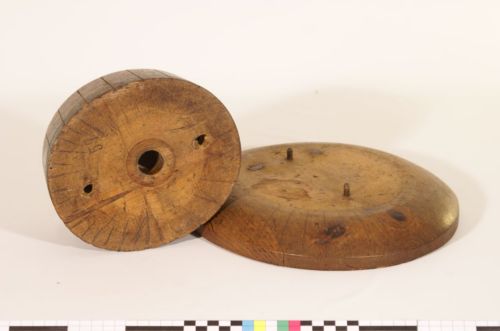modellazione del cappello durante l'intreccio - calotta e ala, che devono corrispondere secondo la taglia, sono dotate di solchi incisi a raggiera che si dipartono dalla sommità della calotta fin sull'ala per tracciare l'ordito dell'intreccio. Il cappello viene intrecciato sulla forma, i fili di paglia fissati con spilli sulla sommità.Un foro nella parte inferiore permette di infilzarla su un palo di sostegno detto #omo#. Le forme per cappelli, oltreché venire utilizzate nelle fabbriche e nei laboratori, erano date in comodato d'uso alle lavoranti a domicilio