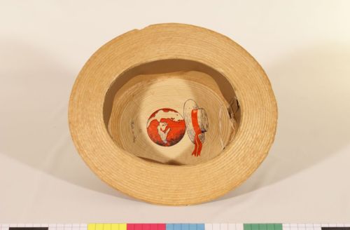 l'etichetta di forma ovale è decorata con un mappamondo sormontato da una paglietta alla veneziana in bicromia nero/rosso, con sotto l'indicazione "Made in Italy" ed il n. "55" che indica la taglia del cappello