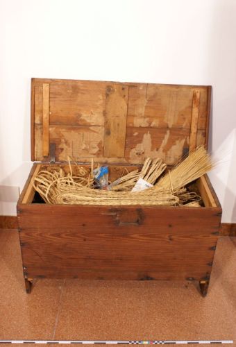sbiancamento delle festuche e/o delle trecce - per schiarire la tonalità del giallo della paglia, #fastùghi# ancora da intrecciare o trecce già pronte venivano deposti la sera all'interno di queste casse, impilati nel senso dell'altezza, lasciando appena lo spazio per un contenitore (di solito una vecchia scodella sbeccata), contenente ceneri e braci sulle quali si spargeva zolfo in polvere che vaporizzava lentamente tutta la notte, dopo per chiuso e sigillato il coperchio; le matasse di treccia (#pachi de dressa#) così sbiancati dall'azione dei vapori sulfurei venivano poi ceduti ai mercanti intermediari o adoperati per l'ulteriore lavorazione