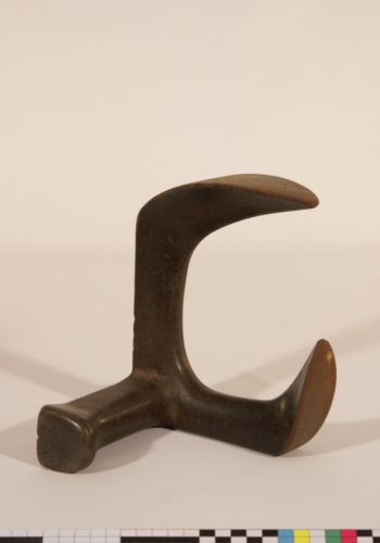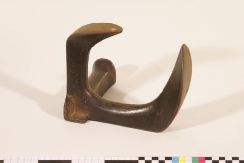 ribattere i chiodi sulle scarpe - il treppiede, o #fórma de fèro#, appoggiata sul deschetto costituiva il supporto sul quale infilare la scarpa per infiggervi i chiodi e le brocche; in particolare le due ali di diversa ampiezza sostengono la suola, mentre il braccio più tozzo sostiene il tacco