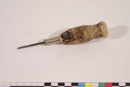 cucitura a mano delle suole alla tomaia - la lésina è uno strumento composto di un manico e di un ferro appuntito, più o meno ricurvo, che serve ad aprire i fori entro i quali passa lo spago per le cuciture; il ferro è intercambiabile, talora dotato di una scanalatura (come nell'esemplare in questione) per far passare il filo già al momento di operare il foro su materiali, come la gomma, che tendono a richiudersi una volta estratto l'ago