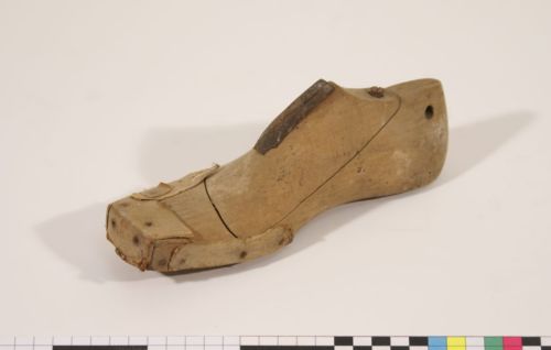 modellatura della scarpa - servono un paio di forme (una destra ed una sinistra) per ciascun numero di scarpe, ma in questo caso è rimasto solo l'esemplare destro; sulla punta sono apposte con chiodini delle strisce di cartone pressato (rimovibili) per modificare la forma e adattarla meglio alla pianta del piede; stessa funzione ha la striscia di cuoio applicata sul collo del piede