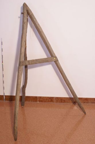appoggia gerla - questo cavalletto mobile permetteva di riempire la gerla tenendola alzata dal terreno, posata sull'assicella trasversa, in modo da facilitare l'operazione di caricarsela sulle spalle