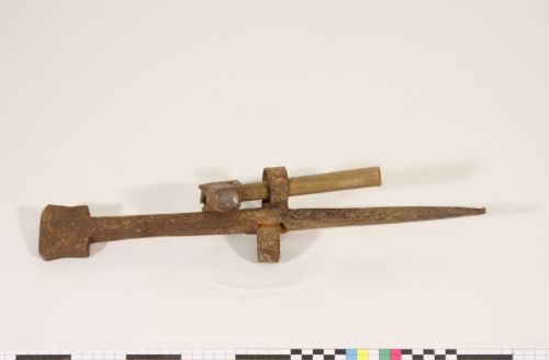 attrezzo per rinnovare il filo della falce - il contadino pianta la parte appuntita della #piàntola# nel terreno; sul cuneo smussato egli batte la falce con la martellina per ripianare il filo ammaccato dagli urti con le pietre