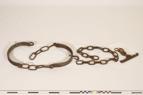 stabulazione dei bovini - il collare viene fissato attorno al collo della vacca; la catena viene agganciata al sottogola (o #bartangóla#) mediante un gancio semiaperto, e permette di legare l'animale alla mangiatoia