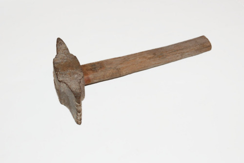 usata sia nellultima fase della levigatura sia nella rifinitura della superficie lapidea, #martelinàr#. Lascia un segno più strisciato e allungato della bocciarda. Questa martellina in particolare era da #scaiàr#, cioè serviva per il lavoro di rettifica delle superfici fatto battendo di spigolo