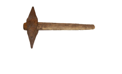 ferro (battitura e sagomatura a caldo/ incisione/ fissaggio a incastro) / legno (sgrossatura/ rifinitura con strumenti da taglio/ fissaggio a incastro)