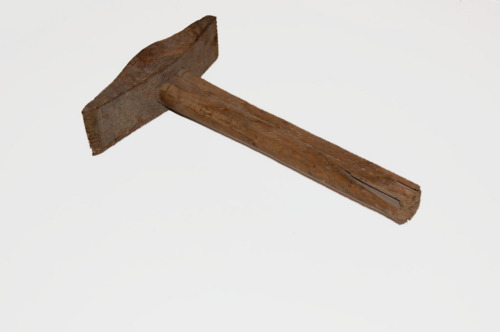 usata sia nellultima fase della levigatura sia nella rifinitura della superficie lapidea, #martelinàr#. Lascia un segno più strisciato e allungato della bocciarda. Questa martellina in particolare era da #scaiàr#, cioè serviva per il lavoro di rettifica delle superfici fatto battendo di spigolo