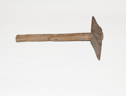 usata sia nellultima fase della levigatura sia nella rifinitura della superficie lapidea, #martelinàr#. Lascia un segno più strisciato e allungato della bocciarda. Questa martellina in particolare era da #scaiàr#, cioè serviva per il lavoro di rettifica delle superfici fatto battendo di spigolo