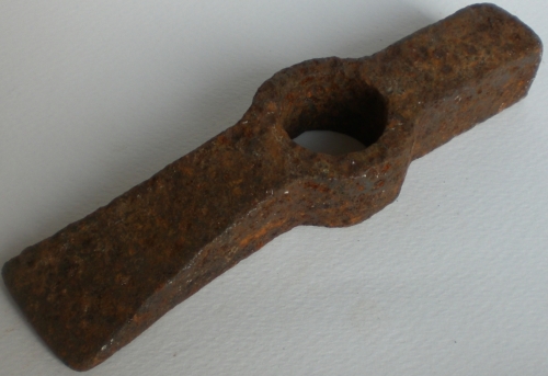 usata sia nellultima fase della levigatura sia nella rifinitura della superficie lapidea, #martelinàr#. Lascia un segno più strisciato e allungato della bocciarda. Questa martellina in particolare era da #scaiàr#, cioè serviva per il lavoro di rettifica delle superfici fatto battendo di spigolo