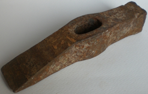 usata sia nellultima fase della levigatura sia nella rifinitura della superficie lapidea, #martelinàr#. Lascia un segno più strisciato e allungato della bocciarda. Questa martellina in particolare era da #scaiàr#, cioè serviva per il lavoro di rettifica delle superfici fatto battendo di spigolo