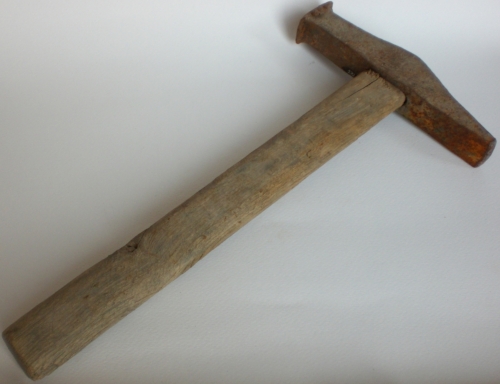 usata sia nellultima fase della levigatura sia nella rifinitura della superficie lapidea, #martelinàr#. Lascia un segno più strisciato e allungato della bocciarda. Questa martellina in particolare era da #scaiàr#, cioè serviva per il lavoro di rettifica delle superfici fatto battendo di spigolo