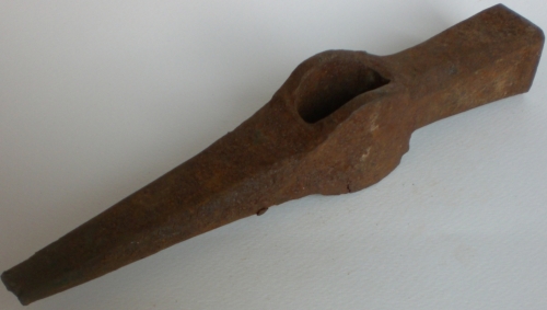 usata sia nellultima fase della levigatura sia nella rifinitura della superficie lapidea, #martelinàr#. Lascia un segno più strisciato e allungato della bocciarda. Questa martellina in particolare era da #scaiàr#, cioè serviva per il lavoro di rettifica delle superfici fatto battendo di spigolo