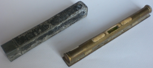 ottone (modellatura a stampo industriale) / pietra (taglio/ modellatura a mano) / vetro (modellatura a stampo industriale) / liquido (inserimento) / latta (modellatura a stampo industriale)