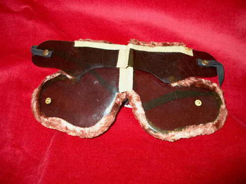 Questi occhiali, ripiegabili, in plastica polarizzata, servivano per la ricognizione dal cielo. Attorno alla mascherina, rifinitura in ciniglia marrone. [Descrizione estratta dal database del Museo dell'Occhiale.]