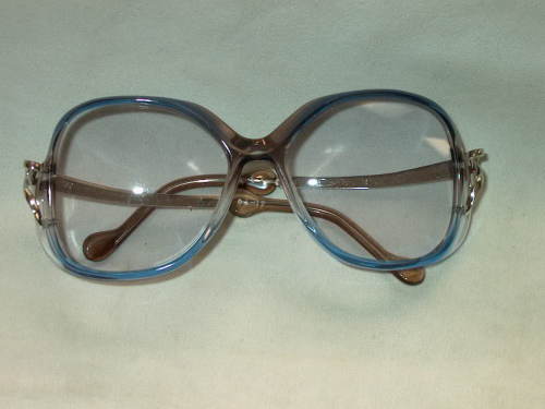 Gli occhiali sono in materiale sintetico colorato nelle sfumature dell'azzurro e le astine in metallo bianco con terminali in plastica caratterizzati da un doppio nodo.