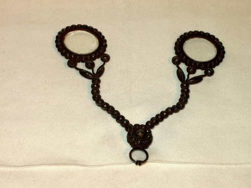 Occhiali a forbice, montati a ciondolo. I due bracci si sviluppano in una forma di voluta vegetale a doppia curvatura, congiungendosi in basso in un perno celato esternamente da un piccolo rosone per parte. I gambi, lavorati in modo da ricordare naturalisticamente forme vegetali, culminano nelle cerchiature che richiamano fiori di girasole con piccoli petali sfaccettati. La stessa decorazione è ripetuta nei due lati. L'esemplare è in ferro "di Berlino" ed è del tipo privo di manico. Il piccolo anello posto sul perno, che serve per appendere gli occhiali al collo, è incorporato ad una rotellina zigrinata. Il termine fassamano deriva dal francese "face à main" e comprende tutti gli occhiali che non venivano indossati sul naso o sul viso. [Descrizione estratta dal database del Museo dell'Occhiale].