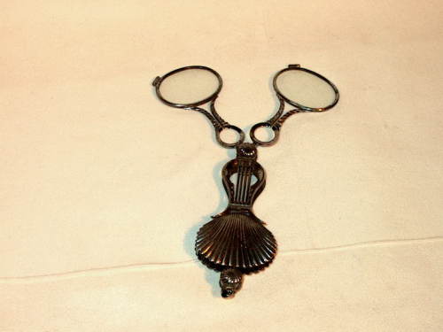 Raffinato fassamano a forbice, montato a ciondolo, in acciaio spazzolato. Le lenti ovali presentano lavorazioni a piccoli incavi sull'esterno dei manici. Molto elegante l'astuccio - impugnatura, sempre in acciaio spazzolato, sagomato a forma di lira, poggiante sopra una conchiglia. Più sotto un rosoncino, simile a quello che decora il perno, a cui è attaccato l'anello per la catena. [Descrizione estratta dal database del Museo dell'Occhiale].