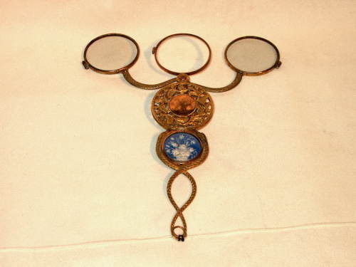 Più sopra, nel mezzo, un cerchio interamente traforato con una decorazione circolare a motivi floreali, entro il quale si nascondono le due lenti. Sono presenti alcune incrinature sul cammeo in pasta di vetro. [Descrizione estratta dal database del Museo dell'Occhiale].