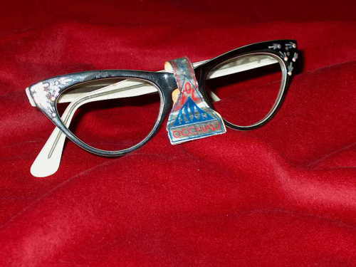 L'esemplare di occhiali, in materiale plastico a due colori, porta ai lati degli oculari abbellimenti e strass. Lo stesso motivo si ripete all'inizio delle stanghette.