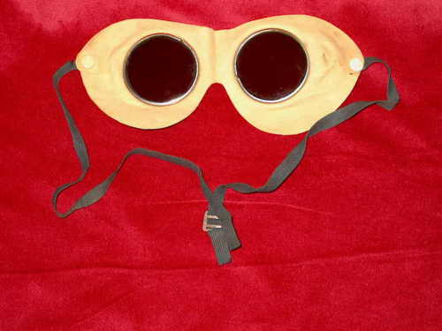 Occhiali da protezione in pelle di daino, lenti in vetro verde, fettuccia per sorreggerli per motociclisti(?). [Descrizione estratta dal database del Museo dell'Occhiale.]