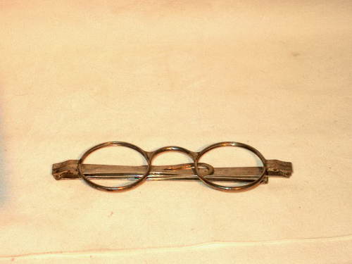 Montatura di manifattura inglese in argento, lenti rotonde, ponte a "C", stanghette a ripiegare a cerniera.