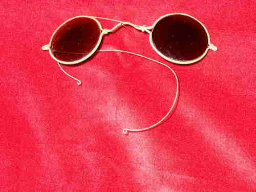 Questo esemplare è costruito in ferro, porta lenti rotonde colorate in marrone ed astine, sottilissime, a riccio.