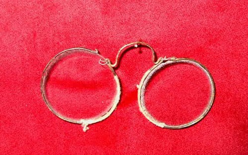 Occhiali ad arco, in argento, con poggianaso ricoperto con fili di seta e lenti rotonde.[Descrizione estratta dal database del Museo dell'Occhiale].