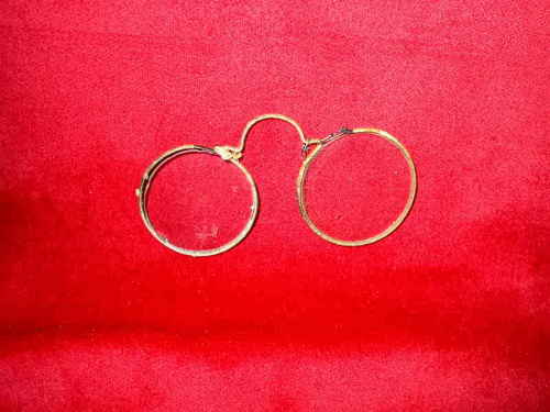 Occhiali ad arco in rame, firmati MICHAEL GALSTER - Francoforte. L'esemplare è completamente rivestito sulla montatura da un filo di seta sottilissimo. Si fanno risalire approssimativamente al 1730.