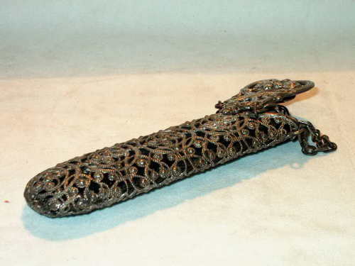 Astuccio a chàtelaine in metallo argentato con gancio del medesimo materiale. Sul dorso sono incisi dei motivi semplici.