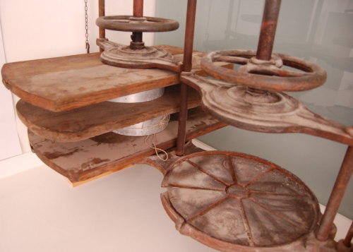ferro (battitura e sagomatura a caldo) / ferro (produzione industriale) / ghisa (produzione industriale) / legno (sgrossatura/ piallatura/ fissaggio con chiodi e lamelle di rame)