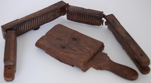 legno (sgrossatura/ rifinitura/ intaglio/ assemblaggio a incastro/ assemblaggio con registri e chiodi) / ferro (battitura e sagomatura a caldo) / ottone (battitura e sagomatura a caldo)