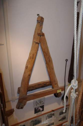 supporto per la piegatura a caldo delle tavole del fasciame #majeri# - La tavola, inserita sotto l' asse interna e sopra l'asse esterna, veniva appesantita sopra l'estremità libera da un carico approssimativamente calcolato. Quindi, dopo aver collocato degli stracci bagnati sopra il punto prescelto di curvatura, e del fango #tèra crèa# al di sotto di esso, si accendeva un fuoco di canne palustri #canèle# le cui fiamme lambivano, ma non bruciavano, la faccia inferiore del #majèro# che, per il calore e il vapore, si piegava lentamente.