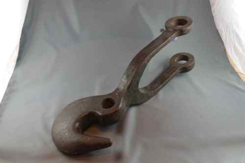 Pesante gancio da cantiere, simile nella forma a quelli montati sui rimorchiatori. Munito di foro per l'inserimento del perno che fungeva da fulcro, si biforca in due staffe simmetriche fornite di occhio per il fissaggio.Notizie storico-critiche