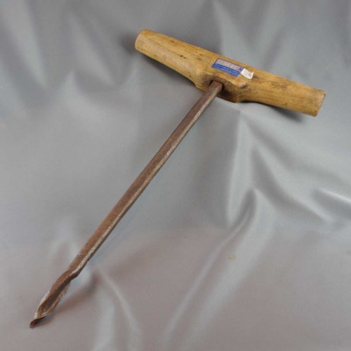 Trivella con asta a sezione quadrangolare (di dimensioni relativamente grandi) e punta elicoidale. L'impugnatura è costituita da un pezzo di legno tornito e lievemente rastremato verso le estremità nel quale si infila l'asta dello strumento.Notizie storico-critiche