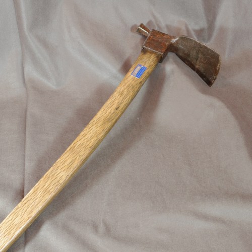 Ascia a zappa a taglio pressochè rettilineo e occhiello a sezione rettangolare. Nella parte opposta alla lama è collocato un blocchetto a forma di tronco di piramide a base quadrangolare.Notizie storico-critiche