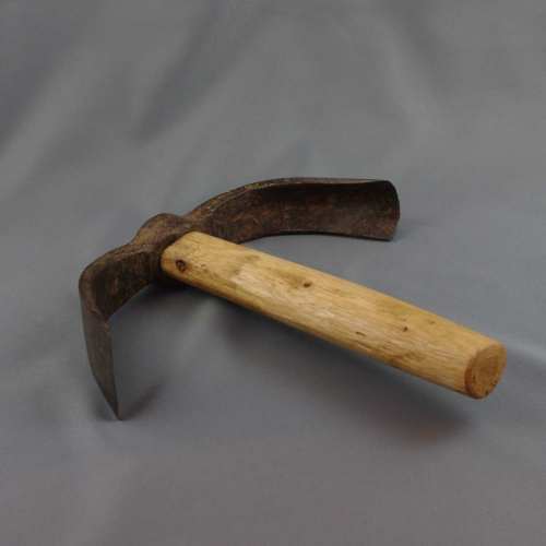 Ascia a zappa bilama. Entrambe le lame presentano un profilo arcuato; se osservati frontalmente, un taglio risulta rettilineo, l'altro piuttosto curvato. Il manico, inserito in un occhio a sezione ellittica, è piuttosto corto.