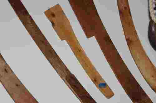 Dima di forma lievemente curva per tracciare il profilo dei #mancoleti#, ossia di bitte piuttosto piccole che venivano collocate in corrispondenza delle assi di rinforzo a poppa e a prua (rispettivamente #soia# e #suei#). Naturalmente, la parte in alto, in corrispondenza della zona della bitta in cui venivano legate le cime, è più grossa della parte inferiore.