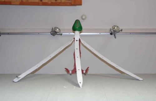 Puntale metallico a forma di pigna dal quale si dipartono quattro lunghe supporti nastriformi #làme# con i fori per i chiodi di fissaggio. La #làma# superiore è arricchita, all'estremità, con un doppio ricciolo divergente che richiama la forma di una piccola ancora a due marre. E' verniciato di bianco e le #làme# di verde. Era collocato all'estremità della prua del burchio, dove convergono i legni delle #bànde#, della #pàssara#, delle #sónte e sorasónte#, e dei #suèi#. La #làma# inferiore, con terminale a punta, era inchiodata al centro della #pàssara#; le due laterali lungo le #sónte# e la lama superiore al centro dei #suèi#.