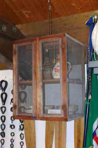 contenere oggetti e/o vivande preservandoli dal contatto con mosche e altri insetti: era appeso #sóto pròva# con un chiodo piantato sulla #caéna maìstra#. Ai chiodi si appendevano di solito salamìni, lardo, #panséta e lugàneghe#. Il burro, invece, era collocato dentro una tazza piena d' acqua per impedirne lo squagliamento. Durante i mesi estivi il moschéto, durante la notte, veniva collocato in coperta per rinfrescare gli alimenti.