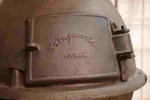 Stufa in ghisa a forma di anfora, poggiante su un piedistallo a quattro gambe, è dotata di un portello rettangolare. Sopra il contenitore della cenere a tronco di piramide, provvisto di registro circolare per la regolazione dell'afflusso dell'aria si innalza un ampio forno ovoidale diviso in due settori. Quello inferiore è ornato da costolature in rilievo, mentre quello superiore è liscio. Sopra il forno si apre, armoniosamente raccordato, il piccolo e rotondo piano di cottura, fornito di imboccatura per il condotto di espurgo del fumo #canón déla stùa# (non originale) e di apertura circolare provvista di tre cerchi concentrici per la chiusura.Notizie storico-critiche