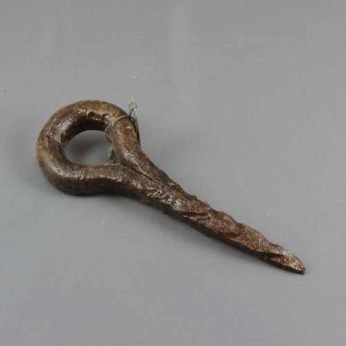 Specie di grosso chiodo ad occhiello (dove veniva fatta passare la corda per tendere il sartiame. Da notare la particolare lavorazione a zigrinatura che caratterizza la parte che penetrava nel legno, la cui funzione era di offrire la maggiore resistenza possibile alla trazione esercitata dal sartiame.Notizie storico-critiche